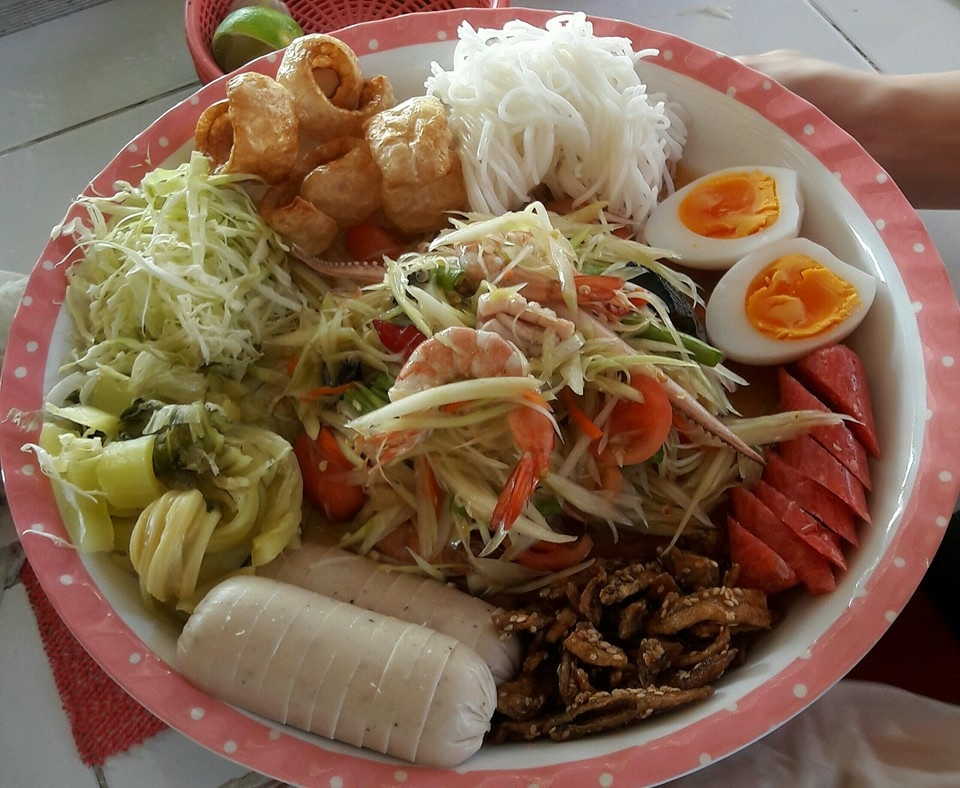 เมนูเด็ด : เริ่มต้นด้วยตำถาดที่เครื่องจัดเต็ม ทั้งกุ้ง หมูยอ ปลากรอบ แคปหมู ไข่ต้ม ผักดอง หมึก แล้วก็แหนม จัดมาเต็มๆ ถาดละ 120 บาท ส่วนอาหารอีสานอื่นๆ อย่างลาบ น้ำตก ก็ราคามาตรฐานสากลที่ 50 บาท