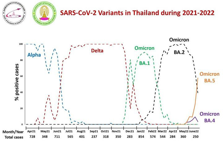 ข้อมูลจากนพ.ยง ภู่วรวรรณ ระบุว่า หลังจากนักเรียนเปิดเทอม โควิด 19 ก็ได้มีการระบาดเพิ่มขึ้นมาโดยตลอด โดยเฉพาะในช่วง 2 อาทิตย์หลังนี้ มีผู้ป่วยจำนวนมาก ส่วนใหญ่อาการไม่รุนแรง โดยเฉพาะในเด็ก ถ้าดูการเปลี่ยนแปลงสายพันธุ์ ที่ศูนย์ฯ ได้ทำการตรวจมาโดยตลอด จะเห็นได้ชัดว่า แต่ละสายพันธุ์จะครองพื้นที่ อยู่ไม่นาน กราฟที่เห็นจะเห็นได้ชัดว่า สายพันธุ์โอมิครอน เปลี่ยนจาก BA.1 มาเป็น BA.2 และ ในเดือนนี้ สายพันธุ์ BA.2 กำลังจะถูกแทนที่ด้วยสายพันธุ์ BA.5 ในอาทิตย์ที่ผ่านมาจนถึงวันนี้ สายพันธุ์ BA.5 กำลังจะยึดพื้นที่ทั้งหมดแทน BA.2 ทุกครั้งที่มีการเปลี่ยนแปลงสายพันธุ์ การระบาดจะเพิ่มขึ้นเป็นระลอก สายพันธุ์ BA.5 เป็นสายพันธุ์ที่หลบหลีกภูมิต้านทานของวัคซีนได้สูงขึ้นไปอีก จึงไม่แปลกที่ฉีดวัคซีนแล้ว มีโอกาสติดโรคได้ อย่างไรก็ตามอาการของโรคที่ผ่านมา ก็ไม่ได้รุนแรง ถ้านับจำนวนทั้งหมดของผู้ติดเชื้อ ขณะนี้น่าจะอยู่ที่หลายหมื่นคน มากกว่ายอดที่รับไว้ในโรงพยาบาลที่กระทรวงรายงาน หลายสิบเท่า ดังนั้นอัตราการเสียชีวิตขณะนี้น่าจะน้อยกว่า 0.1 เปอร์เซ็นต์ของผู้ที่ติดเชื้อ และผู้ที่เสียชีวิตส่วนใหญ่ก็ยังเป็น 608 และผู้ที่ได้รับวัคซีนไม่ครบ 3 เข็ม วัคซีนช่วยลดความรุนแรงของโรคได้ ทำให้การระบาดขึ้นสูงขณะนี้ จึงสามารถดูแลรักษาที่บ้านได้เป็นจำนวนมาก